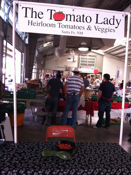 Today was a good day! First day back as The Tomato Lady’ at the Santa Fe Farmers market sold out. A great big thank you to all my patrons who waited for my tomatoes to ripen!  Many thanks! Only a handful of tomatoes and 1 zucchini left. Behind my table are some other vendors at their tables. See you next week!