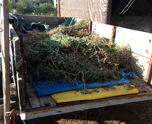 I finished weeding the main vegetable garden yesterday-did the last 1000 sq feet in section 3 in one day! Oh, my aching back. My main vegetable garden is divided into 3 sections, each section being about 1000 sq feet. Section 1 is the most fertile, being the original section built on 13 years of composted horse manure 6 years ago in 2008. Section 2- I built originally for my giant pumpkins 5 years ago but I moved them (being the gorillas that they are) after they took over the rest of the garden and Section 3-I built last year so I could get my tomatoes (50 plants this year survived) on a 3 year rotation cycle since I grow a fair amount for the Santa Fe Farmer’s Market. I rotate them to one of the three sections every year. Meanwhile my giant pumpkins moved over to the unused part of the horse corral about 3 years ago and they have 2000 sq feet all to themselves. Well almost-I have 14 more tomato plants over there. The only part left to weed is the paths around the gardens, the apple trees and about half of the pumpkin patch. Progress!