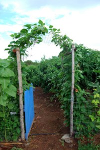Here is a picture of the garden arbor in my entrance to the veggie garden. The ‘Rattlesnake’ beans, a pole variety that can grow 13 feet a season, are doing really well covering the arbor-just like I envisioned when I built it at the beginning of the season. An added bonus is they taste great. You only have to pick the beans before they get too big and tough. I ate some raw right out of the garden and they have a nutty sweet flavor that I like better than the ‘Contender’ bush beans that are just finishing up. Rattlesnake beans are a winner!