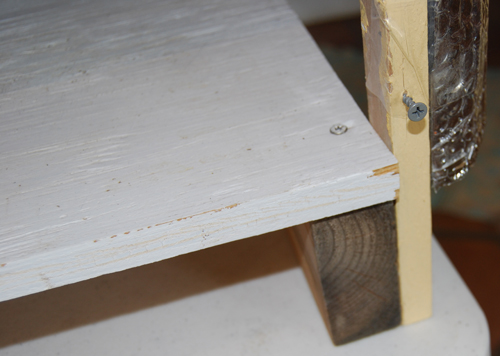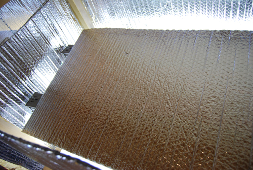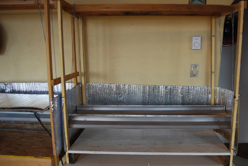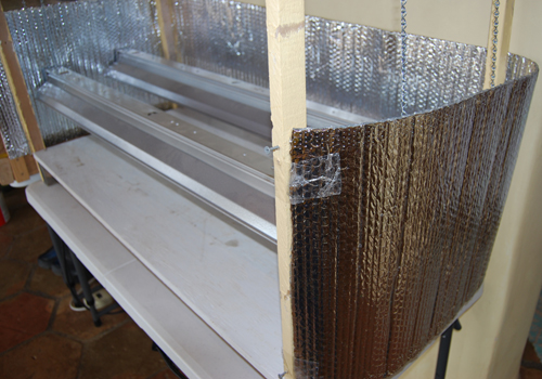 4. FOIL INSULATION: I buy a roll of foil insulation (looks like foil bubble wrap) from Home Depot or Lowes to wrap the outside of the light box on three sides. I attach it with wrapping tape to the corners. I left the front piece separate so I can take it on and off. Notice the screws in the front of the wood so I can hang the front piece of insulation off them. I made some holes in the foil (I reinforced the area where the holes will be with more packing tape so the holes won’t stretch too much).