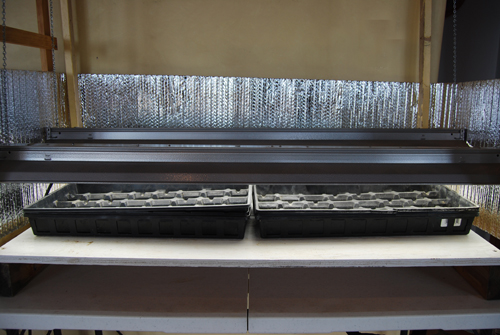 I use a full spectrum florescent light bulbs (called daylight) instead of a plant ‘gro’ light for the shop lights I use in my light boxes to start my seedlings. Full spectrum lights were originally designed for people who get SAD (Seasonal affective disorder, also known as winter depression or winter blues and live and work under regular florescent lights. Full spectrum lights are a little more expensive than regular cool white florescent lights, but cheaper than the ‘gro lights’ marketed to the gardener and provide basically the same lighting as a ‘gro light’. You can get them at the hardware stores. One thing, be sure to buy a high lumen output bulb (6500k), not the energy saver bulbs that are more common now. They produce less “leggy” seedlings.