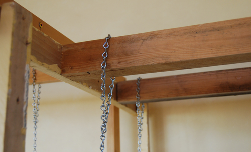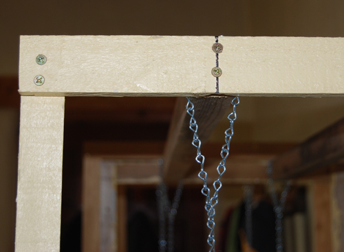 I screwed them in from the outside. They are set 6″ in from the front and back so the lights can hang and not touch each other.