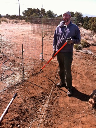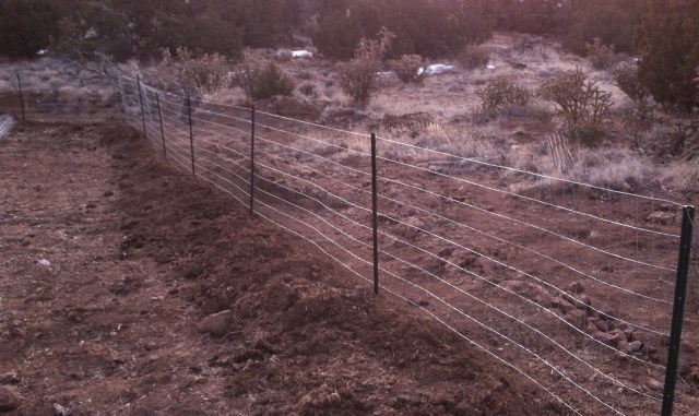 the same t-post in the right side of this picture. Now it is starting to come along a little. I rototilled it in November to loosen up the soil (if possible) and kick out many rocks. I think I’ll make an Andy Goldsworthy style of rock sculpture from all the rocks I will have taken out when I’m done. Today I put part of some fencing up after I raked up a ton of dirt and dragged it into what will be the garden area. I had to quit because it got sooo cold. I thought it was suppose to be 53°F today. Liars! It was 27°F at 4:45 pm. Notice all the rocks on the outside of the fence! Now I know how the pioneers must have felt breaking ground… I’ll have to update you with more pictures later when I can get out and do more work on it.