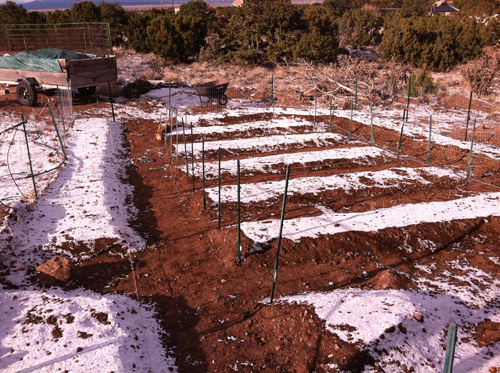 Here is a picture of the new vegetable garden section this morning after a dusting of snow. It is now fenced completely except for the 2 gates, one of which was created today but still needs to be hung. All the raised beds are done.