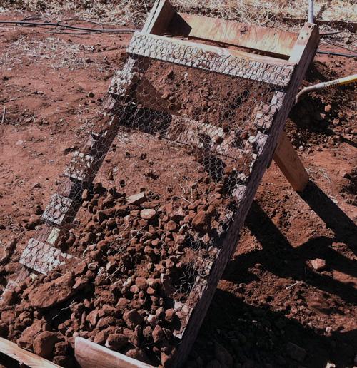 My friend Adam made a sifter to sift out rocks from soil when creating new garden beds. It is a simple contraption made with stuff I had lying around. He found a pallet and cut it in half. Then he screwed 2 layers of chicken wire onto the pallet. He used two 2×4 as portable legs to lean it up on an angle. Then you just put a shovelful of your rocky soil on it and the dirt falls through while the rocks roll off. The soil is light and fluffy and ready to add compost or horse manure to it. When I later looked up how much one is you can buy online, they were $250! Here is Caleb using it on a new garden bed.