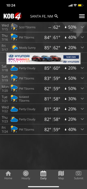 I don’t know about you, but I’ve been feeling the heat lately and try to get out early in the morning and sometimes a little in the evening in the veggie garden if it cools down. So my gardening time is limited to when it is cooler. Of course it’s not as hot as where I grew up in Phoenix, AZ (I escaped)! Above is the forecast thru July 28 for Santa Fe. Looks like it’s going to cool down a little.