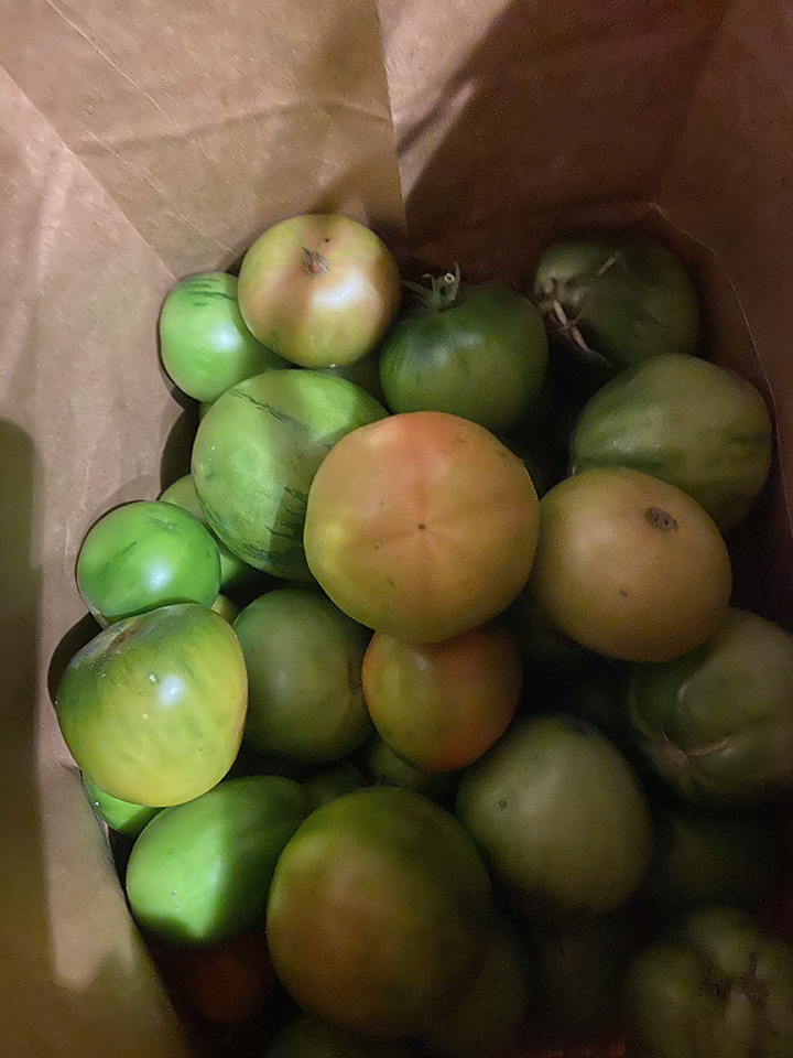 Place tomatoes that are just starting to get color in another bag and move the ones that are starting to color up from the ‘green’ bag. Look into your ‘green’ tomato bag every few days and move them to the ‘just starting to color’ bags.