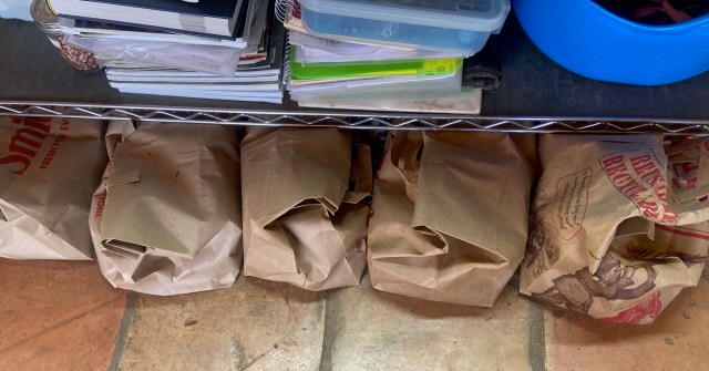 Close up all the bags so the apple does it’s work and none of the gas is released. I fold the paper bags over several times and then I put either something on top of the bags to keep them closed or I shove them under a rack to help keep them closed as shown above.