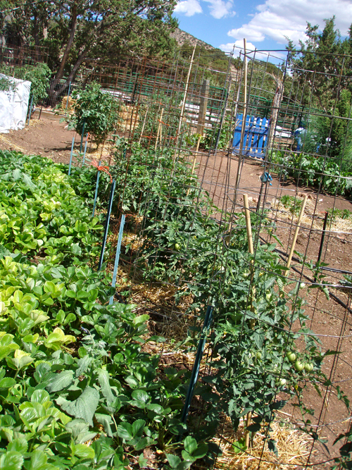 Here are my earliest tomatoes on the right that may allow me to go to the market sooner than later. On the left is my strawberry patch.