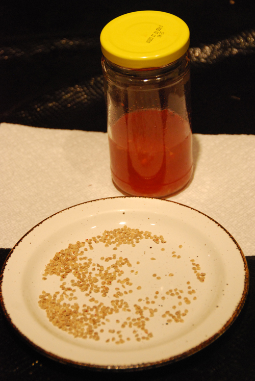 To collect tomato seeds, cut the tomato open, squeeze and scrape out all the seeds and put them in a little jar with some water. Then put the lid on. Try to not get too much pulp in with them. The seed/water mixture will start to ferment in a couple of days and it might bubble a little which is good. The fermentation will remove the slime on the seeds and the seeds will fall to the bottom of the mixture. When almost all the seeds are on the bottom, pour out the liquid, seeds and pulp through a fine sieve, removing the pulp. Keep rinsing until only the seeds are left. Spread them out on a paper towel to drain the excess water and then put them on another paper towel to finish drying. Before the seeds dry completely I move them around so the paper doesn’t stick to them. After they are thoroughly dry, put them in a ziplock baggie, label and store. You can keep any heirloom tomato seeds this way.