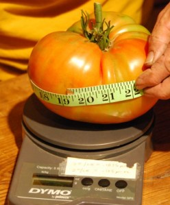This tomato is from a Big Zac variety and is 19.25 inches in circumference and 2 lbs, 14.4 oz in weight. It is still turning red but has completed it’s growth. I didn’t see anything bigger down at the fair. We will see..