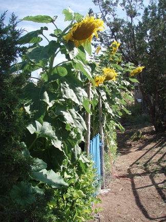 This year I want a beautiful garden as well as a bountiful one. I planted tons of flowers in the entry way and along the entry fence. Inside the entry fence I planted Titan sunflowers again (I call these the ‘guardian angels’ of the garden) which will grow behind some scarlet runner beans (good hummingbird attractors) that will grow up the fence. Last year the Titan sunflowers got 10 feet tall and heads up to 18 inches across. Then in the entry arbor I planted rattlesnake beans (a green and purple streaked pole bean) that hopefully will grow all over the arbor giving me a very lush, green entryway (and tasty one too). Then after you walk through the arbor immediately on the left, I’m going to try amaranth-Loves-Lies-Bleeding and cockscomb-Flamingo Feather.  I saw these on the Seed of Change garden tour last fall here in NM and they looked fantastic, so I thought I’d try some. I also planted sunflowers-Goldie and Chianti, Queen Anne’s Lace, Zinnias and Cosmos flowers. All this with the asparagus that I had planted last year in the entryway. I figure I have a few years till the asparagus kicks in-so I’ll plant pretty stuff around it till it does. I am also putting a glass water basin for the birds in this section of the garden.  Last year it was a nice entry and I hope it will be even better this year with the arbor and the flowers.  Hope to have some good pictures later in the season. Ah, fantasies of how it might be..