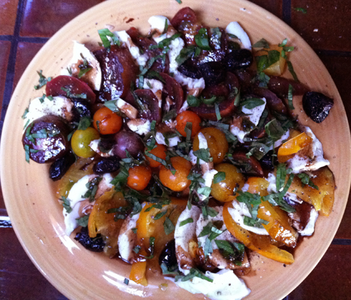 Here is the first caprese salad of 2012! Fantastic! Yellow, orange and black tomatoes with mozzarella, basil and olives drizzled with an 18 yr old balsamic vinaigrette! Been waiting for this since last November! Need I say more?