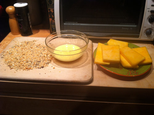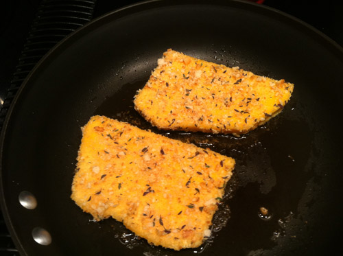 Then press the steaks into the crumbs on both sides. Put some olive oil in a fry pan and heat it up till it is very hot but not smoking.