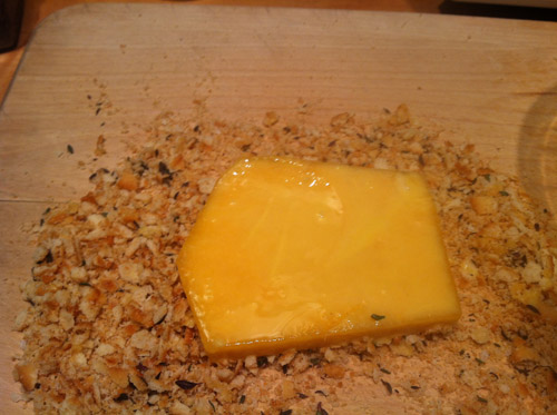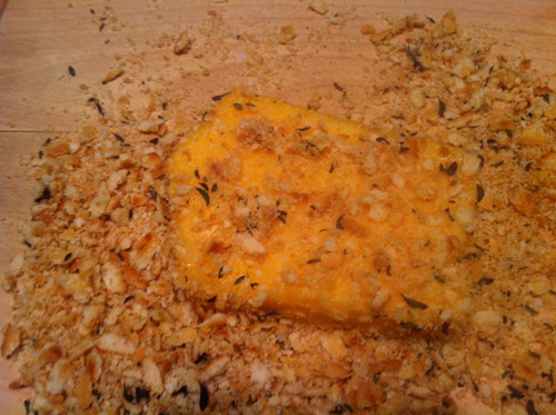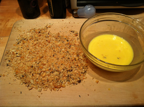 Crush up some Ritz crackers to make cracker crumbs. I like the cracker crumbs better than bread crumbs as they have a  more buttery flavor.  Add some herbs to the crumbs. I added some dried thyme, sea salt and pepper. Beat 2 eggs and some milk in a bowl.