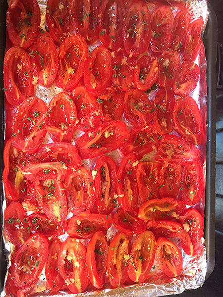 2. Take a cookie sheet and cover it with a big sheet of foil to protect your cookie sheet. Don’t try to piece two pieces together, it won’t work. The tomato juices will leak between the two pieces and what a mess it makes. I first tried it with parchment paper underneath and it was worse so don’t try that either. I learned the hard way and ruined a cookie sheet. Then I spread some olive oil on the sheet so the tomatoes don’t stick and cut my tomatoes in half and put them on the cookie sheet.
