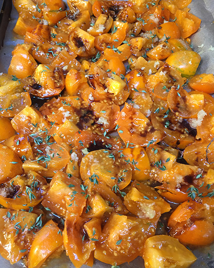 7. Cook and check often till soft and slightly caramelized. I start with half an hour and then keep checking every 15 minutes till done. Should take between 1-2 hrs if your tomatoes are bigger or juicy. There will be some black on the edges and that’s OK but watch closely as it gets closer to done as it can overcook quickly and the whole thing could burn black. A little black good, a lot of black bad. I scrap off the tomatoes (skin and all) off the foil and viola its done! I don’t puree it as I like it chunky and the skins are soft enough that you don’t even notice them.