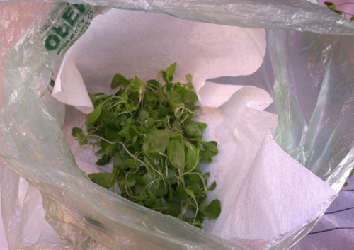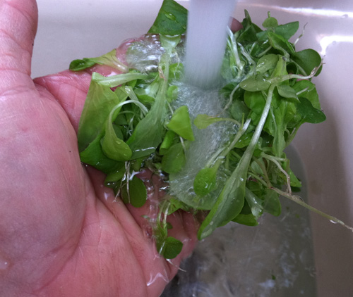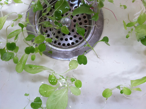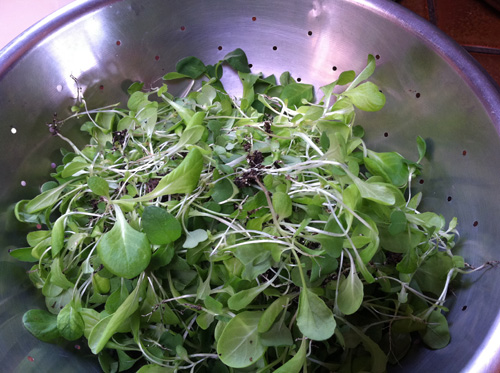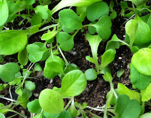 To keep the greens from freezing in the dead of winter in the greenhouse which is unheated, I’ve cover them with one layer of winter weight row cover every night and on some really cold nights (when temperatures got down to 14-17° F), I put two rows of row cover over them. One night the lettuce actually froze. But I read in Elliot Coleman’s Winter Harvest Handbook that if you don’t harvest it when it’s frozen, it may be fine by the afternoon when it warms up and sure enuf, it thawed out and is still growing great. You just can’t harvest it when it’s in a frozen state.
