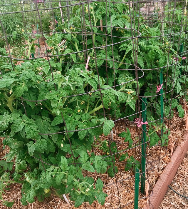 Since we haven’t really had much rain to speak of, after I remove the wall of waters (WOWs), I will put cages on and wrap my cages in medium weight row cover (.55) from top to bottom completely covering the cage. This is to protect the tomato plants from getting exposed/bitten by the Beet Leafhopper which can give your plants CTV (curly top virus) which will be fatal to the plants. I will take the row covers off when the monsoon rains come in ernest which is usually just after July 4th weekend but has come earlier in some years. The bug seems to leave or get suppressed once the monsoons start.