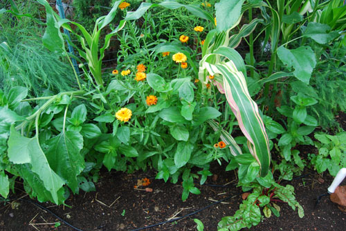 On the left side just inside the entrance, are asparagus fronds, calendula, ”Bright Lights’ chard, ‘Chianti’ sunflowers, multicolor ‘Japonica’ corn from Seedsavers Exchange and other flowers coming along. I got a late start in this section of the garden but it should look great later this month and I will take more pictures then.
