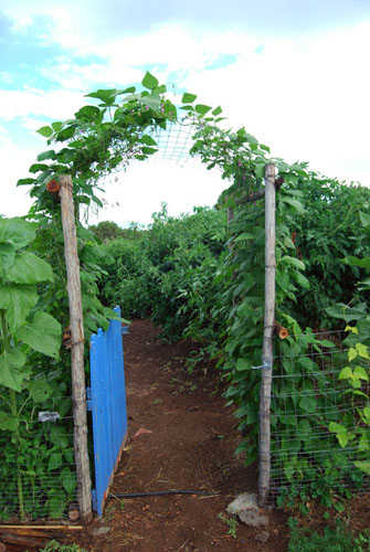 Also pictured to the right of the arbor are chartreuse colored ‘Golden Sunshine’ Scarlet Runner beans  I got from Cook’s Garden growing on the fence. They come from England. I love their bright yellow green leaves against the other greens. I grow them just because they are so beautiful and I love that purple varigated color of the seeds when they are dried. They haven’t flowered yet as they are just climbing the fence but when they do, the bright red blossoms will look great against that yellow-green.