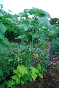 Behind the Scarlet runner beans, still on the right side of the entrance are my giant ‘Titan’ sunflowers that will be fantastic a little later when they get their huge flowers. They will grow up to 10 feet tall and have heads that can get up to 24 inches wide! I call all sunflowers the guardian angels of the garden. Did you know sunflower flower heads follow the sun all day long? Sun worshipers! Hence their name. They are so majestic! Behind them are various flowers that will be blooming soon to add color and attract beneficial insects.