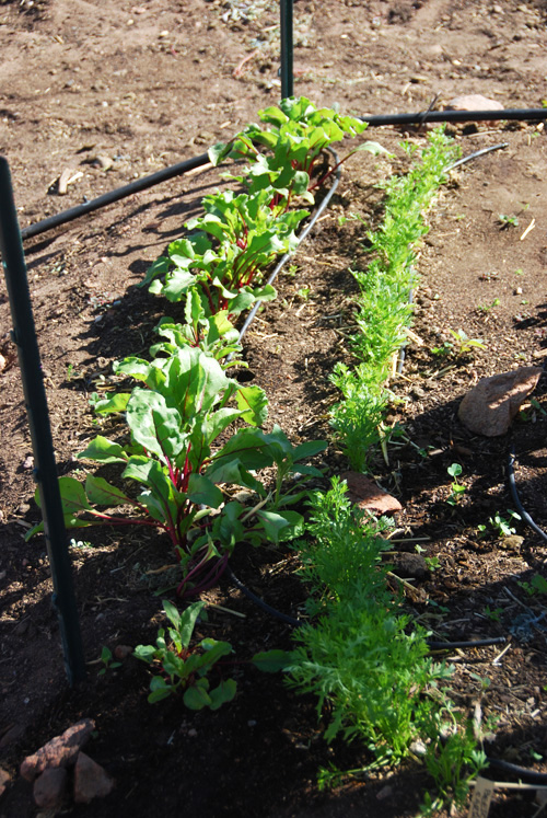 Detroit Red beets, Craupadine beets and Atomic Red carrot seeds were planted directly in the garden. I put row cover over all of them to keep the birds from eating the bean seeds and to keep moisture in the ground for the beets and carrots.  If you’ve had trouble with birds eating germinating seeds, put row cover over them till they get about 3 inches tall. The Detroit beets and carrots are coming up nicely but the Craupadine beets are not. They are so hard for me to germinate compared to other beet seeds-still I try as I love the flavor of them.