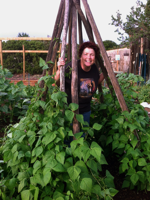 Here is a picture of the garden arbor in my entrance to the veggie garden. The ‘Rattlesnake’ beans, a pole variety that can grow 13 feet a season, are doing really well covering the arbor-just like I envisioned when I built it at the beginning of the season. An added bonus is they taste great. You only have to pick the beans before they get too big and tough. I ate some raw right out of the garden and they have a nutty sweet flavor that I like better than the ‘Contender’ bush beans that are just finishing up. Rattlesnake beans are a winner!