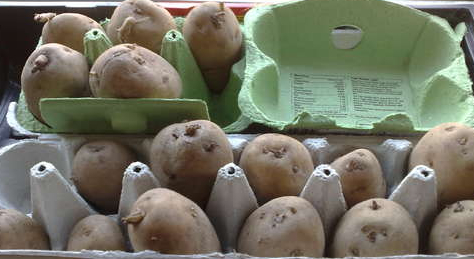 1. Get a couple of egg cartons so you can stand the potatoes with the pointed side down. The blunt side generally produces more sprouts so keep that side up. The egg cartons make it easy to support them this way. Sometimes there is no pointy side which you should then just look at your potato and put the side with the most ‘eyes’ or sprouts up.