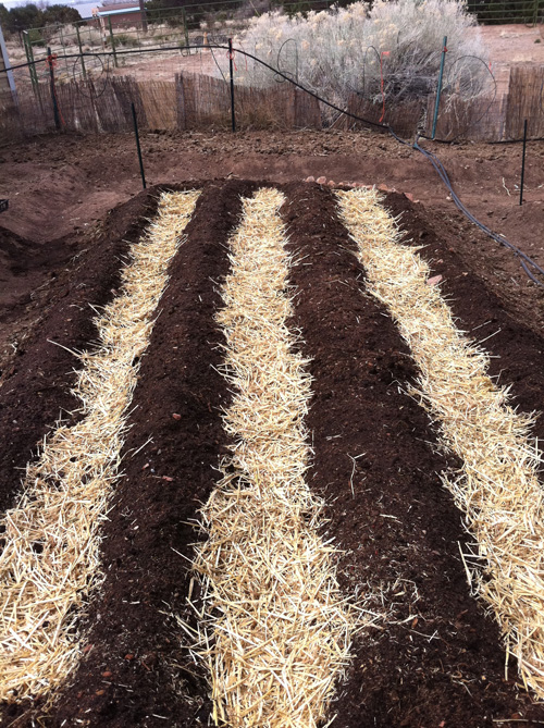 I’m trying a lot of new varieties of vegetables this year besides the varieties I always plant. I’ve never planted potatoes before but thought I’d give them a try this year. I actually planted the potatoes on March 30 and am just now getting around writing about them. I just couldn’t wait any longer. I put them in my best bed that is 12 inches deep with very rich fluffy soil. I figure even if it snowed (which of course it did), the ground wouldn’t freeze up 3-4 inches below the soil where the potatoes are. Plus I got the drip in place (even though it isn’t turned on yet) on the potatoes and covered them with straw to protect them from the snow. I planted all fingerlings-French, Russian Banana and a purple variety. They are not up yet but can’t wait till they are. A brand new crop for me.