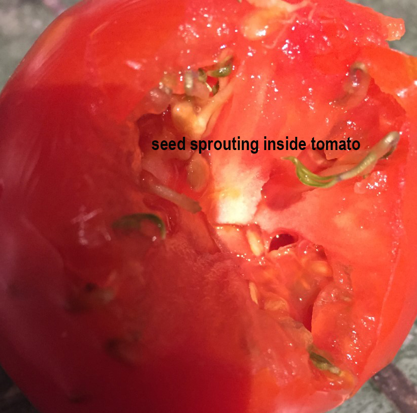 Here’s something you don’t see everyday. Two different people have contacted me about a tomato they each had that was sprouting seeds INSIDE the tomato. Both people said the tomatoes were older. When they cut into their tomatoes, they found tomato seeds prematurely sprouting inside. I haven’t seen that before and had to research it out.