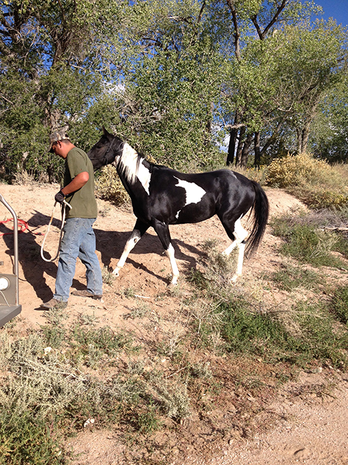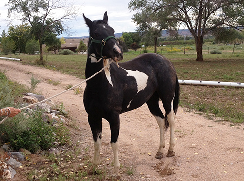 Fast forward to last month when a friend emailed me about Koko needing a home. Her owners who had lived in Nambe moved to town and Koko was being pastured at a neighbor’s place and they needed to find her a home before winter. So we went out and looked at her. She is a beautiful little 2-year-old black and white philly. She is considered a ‘pinto’ with her black and white coloring and is not registered. Pinto can refer to the coloring of a horse and not necessarily the bred and Koko is a mixed bred. I have always wanted a pinto horse, loving the colors and patterns they come in. In my mind’s eye I could see her in our corral even before I got her.