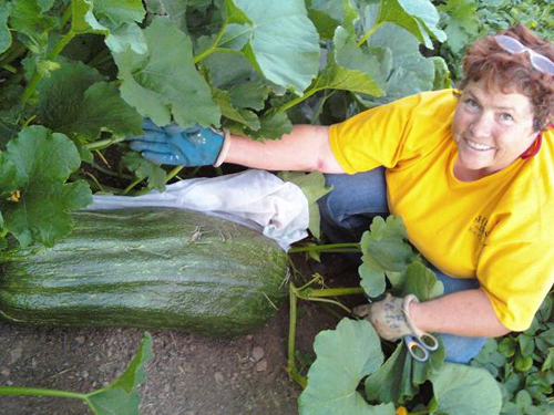 I still left the biggest marrow in the patch to see how big it will grow before the Colorado weigh-offs. It measured almost 30″ long and 14″ wide about a week ago. I think it weighs about 45 lbs right now. Here is a pic of me getting ready to weigh it.
