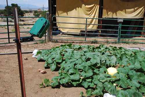 Today I fertilized the pumpkin plants, greenie and marrows with Seaweed and Fish emulsion and added Super Thrive since I took off the shade cloth and they have to adjust again. Mind you they still have a low tunnel over them and another layer of row cover directly on them but I am now weaning them off so much protection since they have gone through their first adjustment well and I see new growth. I also started them on ‘Companion’, an organic fungicide, which helps ward off fungal diseases. All these things go in a bucket of water so it’s easy to apply. They are still taking 1/2 gallon of water a day. I also put chop sticks over the stem (see photo), making an ‘x’ with them, gently pushing the vine down towards the ground. Push the sticks with the plant a little farther towards the ground every few days until the plant is lying on the ground. If you let them stay tall, they could snap off in the wind so I must train them to lay low! This pumpkin plant in the picture comes from the same one that last year grew the 2010 NM State Record. I also have it’s cousin plant (who comes from a bigger pumpkin), but this plant is already much bigger than it’s cousin. I love this seed!