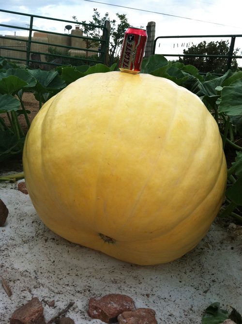I have a giant marrow seed that I got from a grower in the Netherlands that I’m growing this year. They call zucchini squash, courgettes or marrows in Europe. Both zucchini and marrows are in the same family- Curcurbita Pepo. My giant marrow (zucchini) is getting bigger and more gnarly. It is now kept wrapped up tightly with row cover to protect it from the pesky squirrel. I’m not sure how much it weighs as I don’t know of any measurement method like we have for giant pumpkins so it is always a surprise at the State Fair or at the Giant Pumpkin Commonwealth weigh-off in Colorado but it sure looks BIG with that beer can on it for perspective. The US record for this type of giant vegetable is around 90 lbs! Last year, my biggest marrow weighed 43 lbs and set a NM State Record. This one is still growing so we will see!