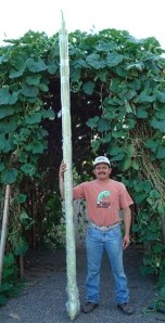 Here are some pictures of the 2007 world record long gourd that reached just over 127 inches that another person grew. The plant is really beautiful. In the picture above the long gourd was so tall they had to dig a hole in the ground so it would keep growing straight! If it hits the ground it will start to curl.