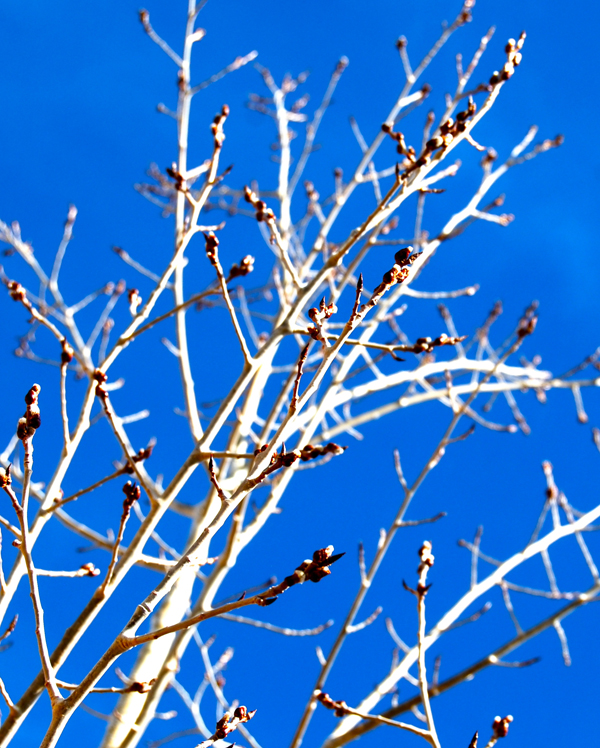 Aspen branches budding out against winter blue sky