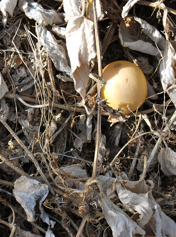 This is what the native Buffalo Gourd looks like in the winter. The gourd starts out as a green gourd, then turns yellow and will mellow to a beautiful ochre color as it dries. Their skin is too thin for making anything out of them but I still like to collect them on walks.