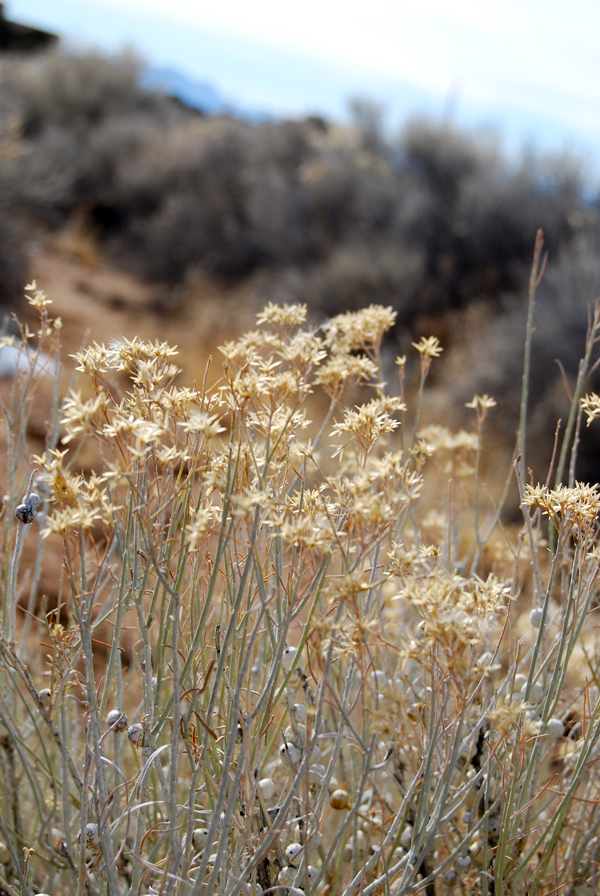 I like the he blue-grey stalks and dried flowers of the Chamisa plant.