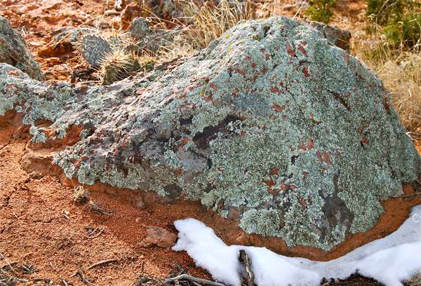 This prickly pear variety had lots of pinks on it. I liked the color against the moss rock and snow