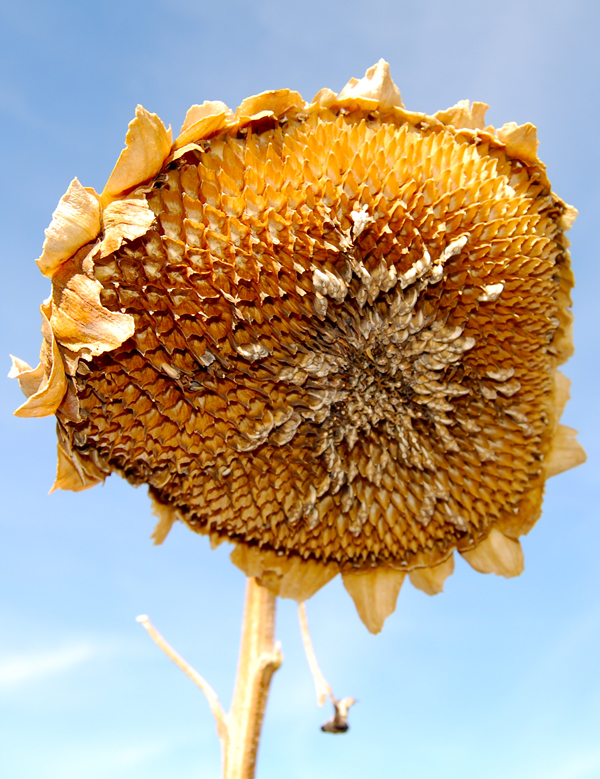 Here is one of the sunflower heads I left in the garden last fall. The birds have gotten almost all of the seeds out of it.