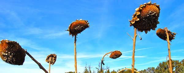Are they alien spaceships? Nah-their just sunflower heads in wintertime.