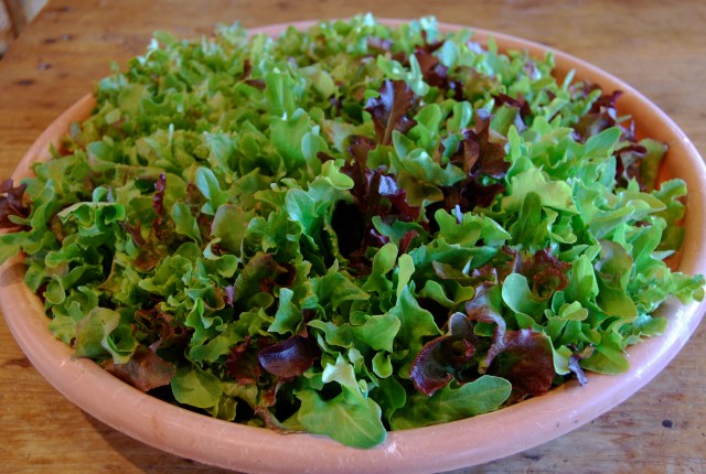 Here it is ready to eat for it’s first cutting in 32 days and at $6.99/lb in the stores, it’s a deal! Harvest by the ‘cut and come again’ method and it will grow back for several cuttings. To do this, simply take sharp scissors and cut off a bunch of leaves in the amount you need to fill your salad bowl. Cut the leaves off at 1 to 2 inches above the soil. Don’t cut the crowns of the lettuce or it won’t grow back. Bon Appétit!