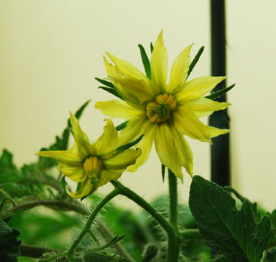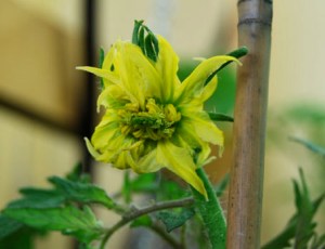 The top picture has two blossoms-the one on the left is a normal single tomato blossom and the one on the right is a megablossom made up of two flowers. Notice how big it is.