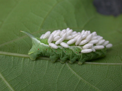 The other thing that is helpful comes from nature itself.  If you see little white cocoon things on the hornworm, leave them alone as a helpful parasitic wasp has layed their eggs on them and the caterpillar will soon die. An added bonus is all the little wasps will attack other hornworm caterpillars. The wasp is not like the wasp we think of that stings us. It is a little thing, almost fly like, doesn’t sting us and is one of those beneficial bugs you would like to have in your garden.