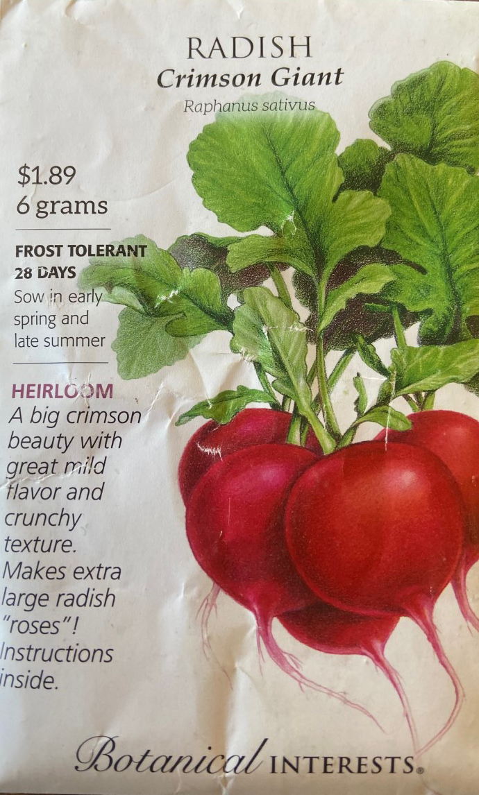 What can you grow in August? The key is to choose crops with less days to harvest so you get to harvest before it freezes. For example some radishes are 28 days to harvest (see photo). Look at your package to see how long before you can harvest. You also need to add 10 more days as the days get shorter and crops will take longer to harvest. So for this radish, 28 days plus 10 days equals 38 days to harvest so you would still have enough time to grow them since our first frost date is around Oct 10 (but could be earlier or later).