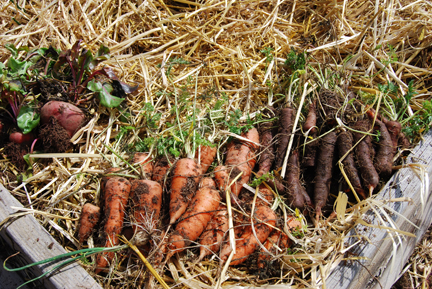 A couple of days ago was beautiful here so I went out and took out the last of my carrots and beets from last year so I can start some new ones for this year. I’ve been taking them out all winter even though it has been really cold here. The secret? I covered them last fall with about a foot of straw and they have been doing nicely under all that insulation. The ground never froze. Here are the carrots after I pulled off the straw and just before I dug them out.